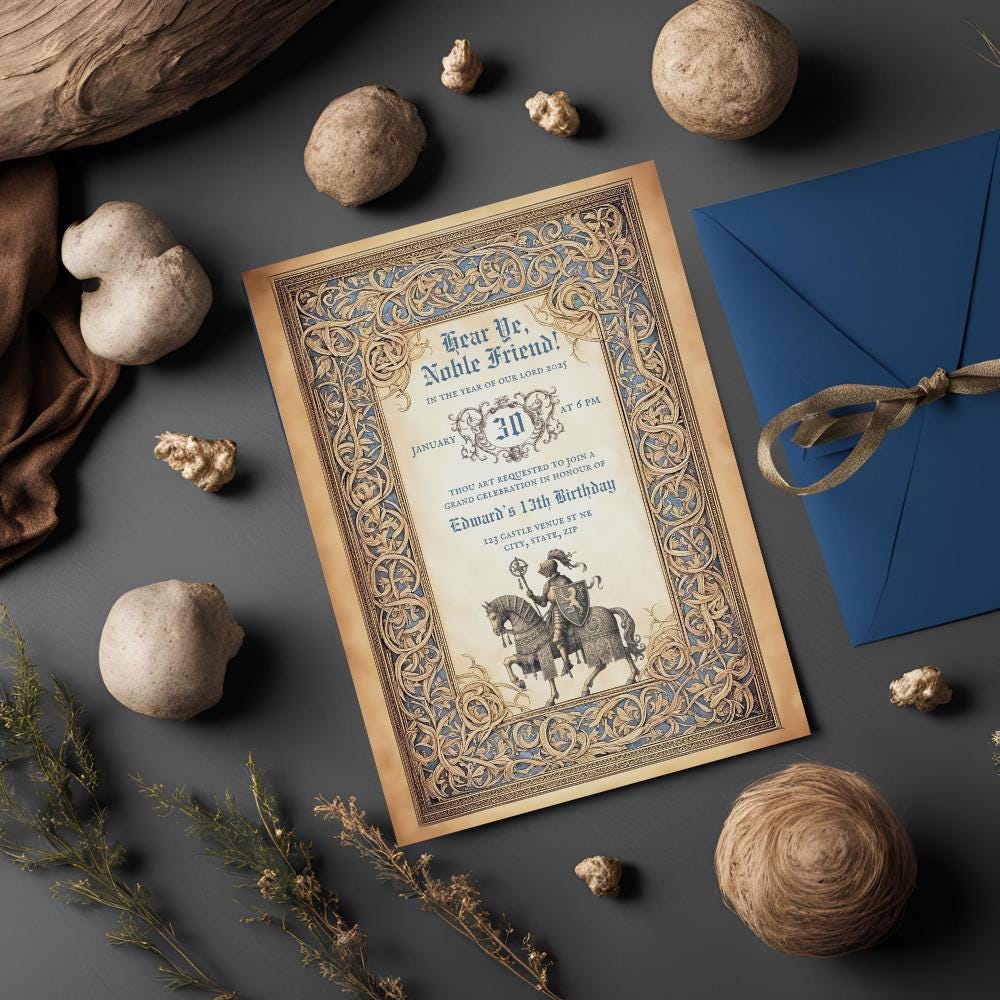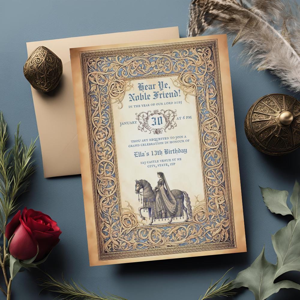 Bring the magic of a medieval celebration to life with these enchanting birthday invitations! Perfect for a royal gathering, each 5x7" printable design features vintage-style artwork inspired by illuminated manuscripts and medieval times. Choose from two unique designs – one featuring a noble knight in armor and the other showcasing an elegant lady in a flowing gown, each riding a beautifully adorned horse.