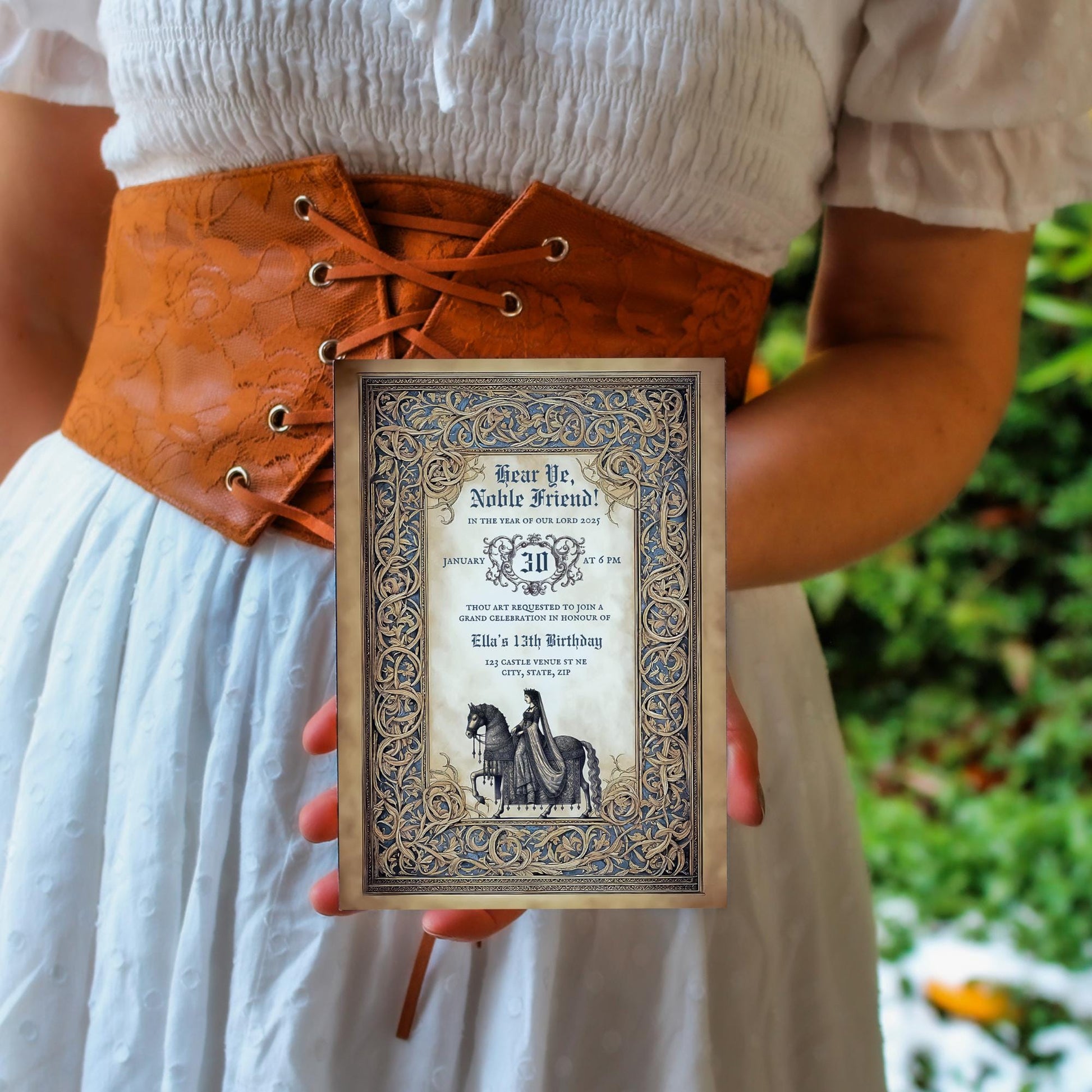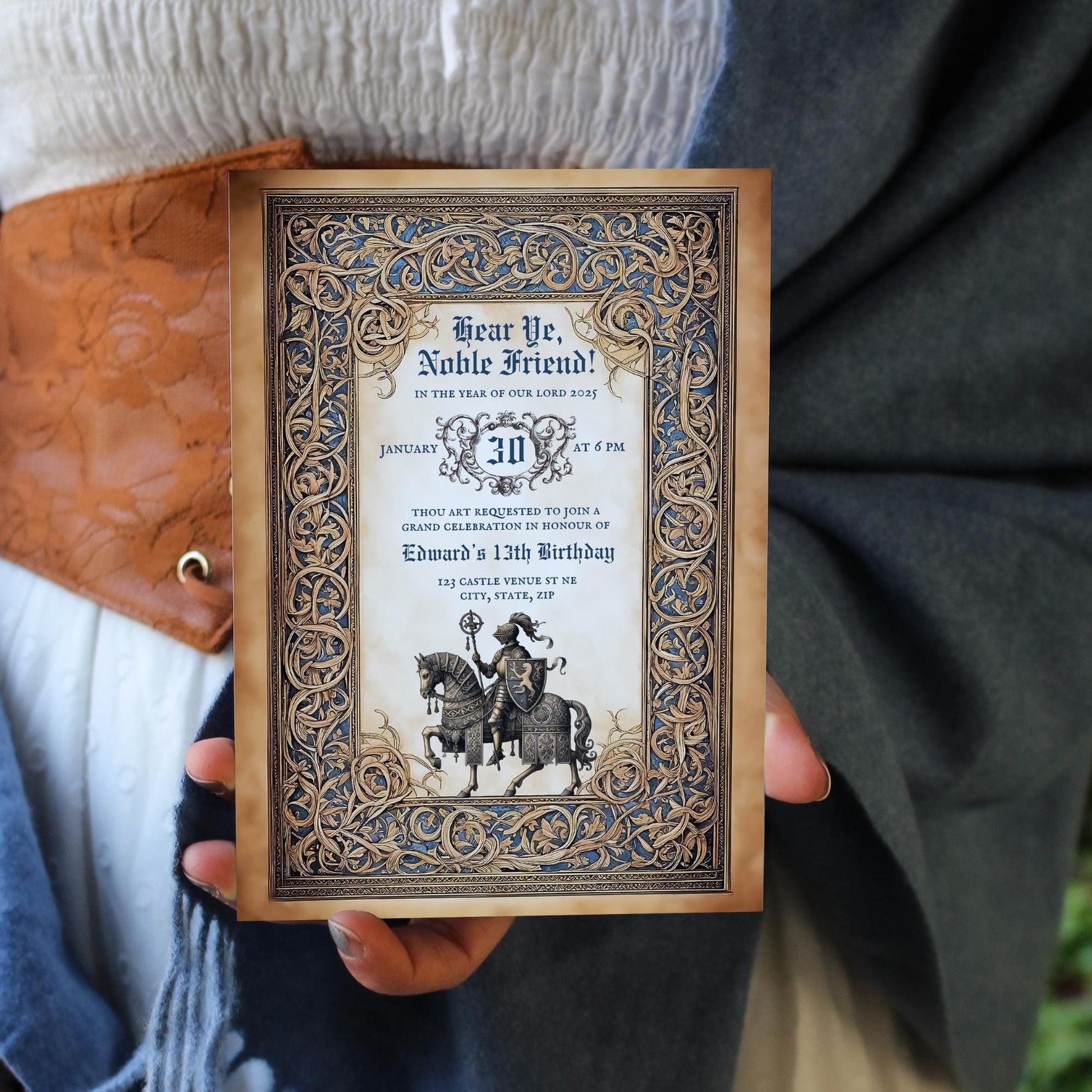 • High-Quality Design: This invitation features beautiful artwork inspired by the Middle Ages setting the scene for a historical celebration.
